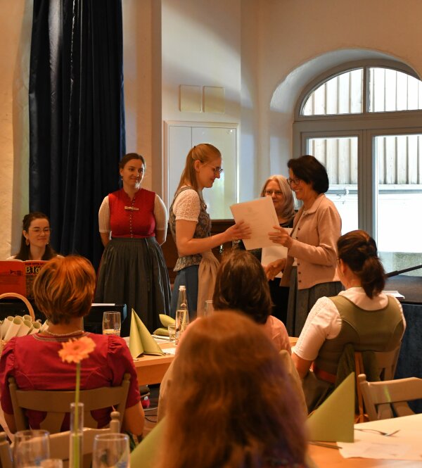 Als nächstes überbrachte die Rosenheimer Kreisbäuerin Katharina Kern den neuen Fachkräften Glückwünsche vom BBV. Ihrer Meinung nach wird die Hauswirtschaft besonders in den Zeiten des zunehmenden Bevölkerungswachstums dringend benötigt. Niemand anderes wisse besser, wie man die Menschen auf gesunde und nachhaltige Weise langfristig versorgen kann. Den Abschluss der Grußworte bildete Barbara Käsweber vom vlf. Sie lud die Absolventinnen dazu ein, sich im Verband zu organisieren und ihr neu erworbenes Wissen durch den Austausch untereinander, das mannigfaltige Weiterbildungsprogramm und interessante Lehrfahrten stetig zu erweitern. Nach der Zeugnisübergabe durch die Semesterleiterin Dr. Juliana von Berlepsch und dem Abschlussfoto überreichten die Lehrkräfte ihren ehemals Studierenden noch persönliche Nachrichten, was sie an jeder einzelnen Studierenden am besonders geschätzt haben. Danach ließen die frisch gebackenen Fachkräfte noch bei Kaffee und selbstgebackenem Kuchen den Tag ausklingen.